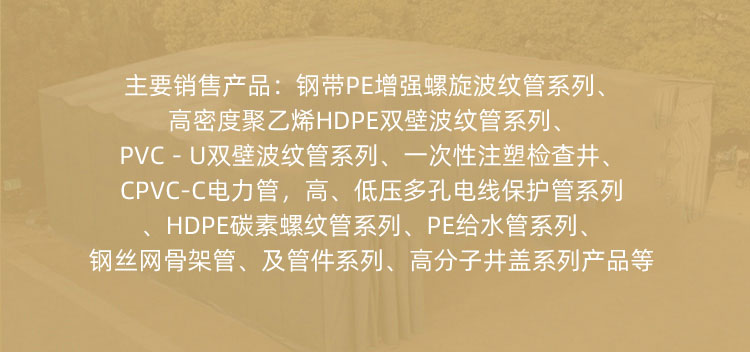 鋼帶PE增強螺旋波紋管系列、高密度聚乙烯HDPE雙壁波紋管系列、PVC-U雙壁波紋管系列、一次性注塑檢查井、CPVC-C電力管,高、低壓多孔電線保護管系列、HDPE碳素螺紋管系列、PE給水管系列、鋼絲網骨架管、及管件系列、高分子井蓋系列產品等等
